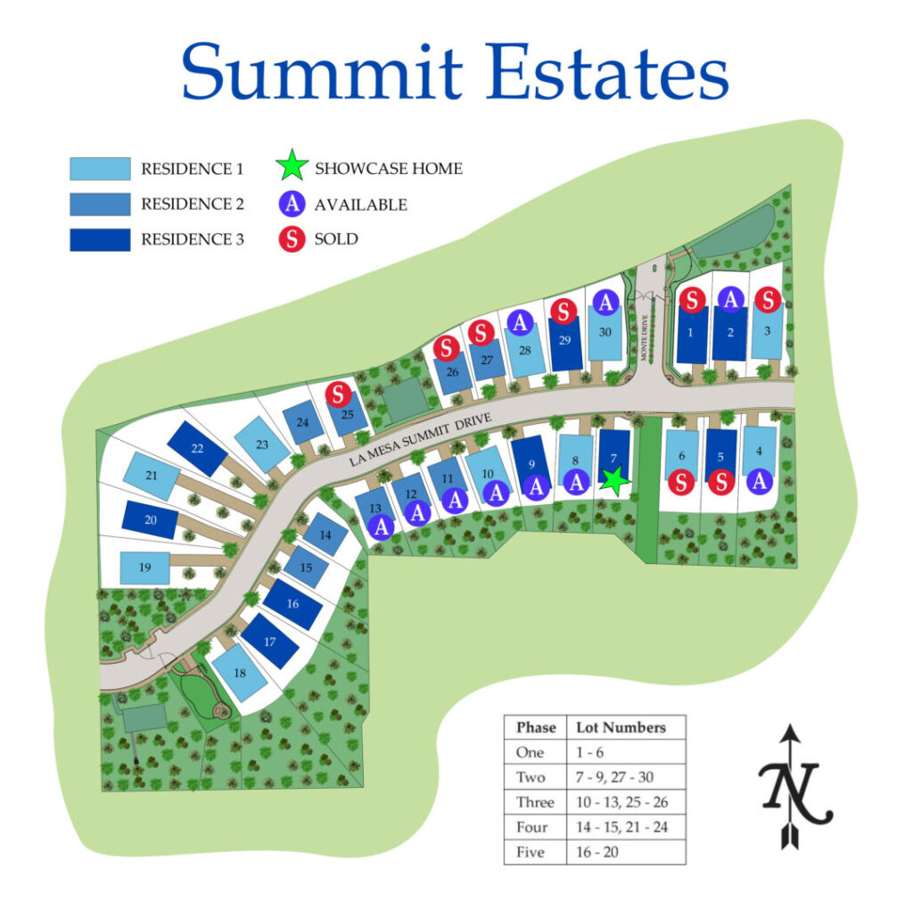 Summit Estates is located in beautiful La Mesa, California. This exclusive new home community is gated and features 30 luxury single-story and two-story estate homes, each with their own large private, fenced backyard.