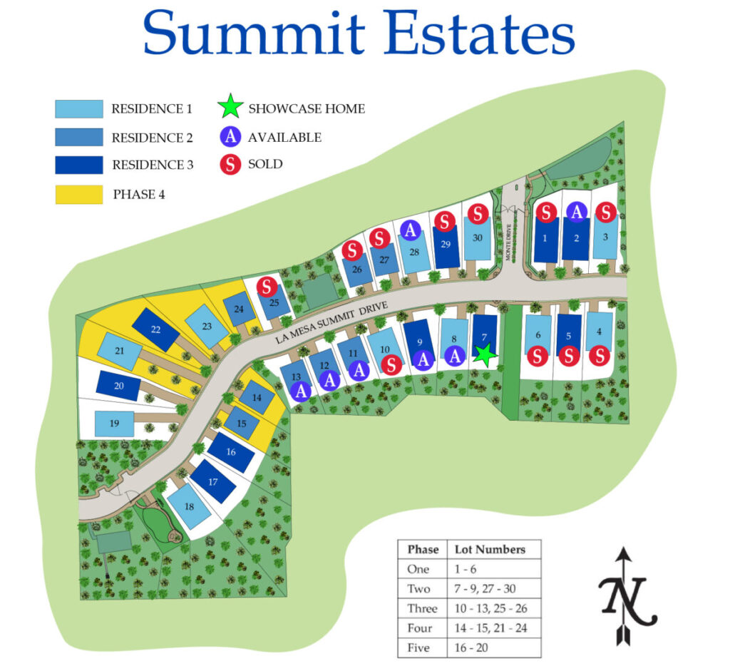 Summit Estates is located in beautiful La Mesa, California. This exclusive new home community is gated and features 30 luxury single-story and two-story estate homes, each with their own large private, fenced backyard.